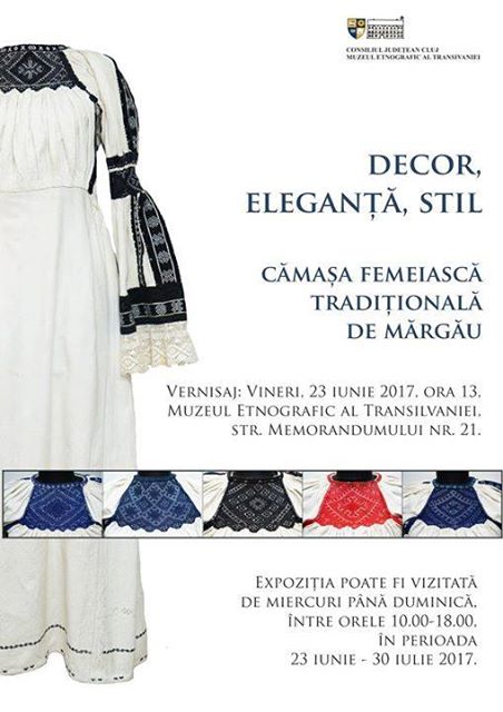Muzeul Etnografic al Transilvaniei, instituţie publică de cultură care funcţionează sub autoritatea Consiliului Judeţean Cluj, invită publicul iubitor de tradiţie vineri, 23 iunie 2017, ora 13.00, la sediul instituţiei din str. Memorandumului nr. 21, la vernisajul expoziţiei ,,Decor, eleganţă, stil – cămaşa femeiască tradiţională de Mărgău”.