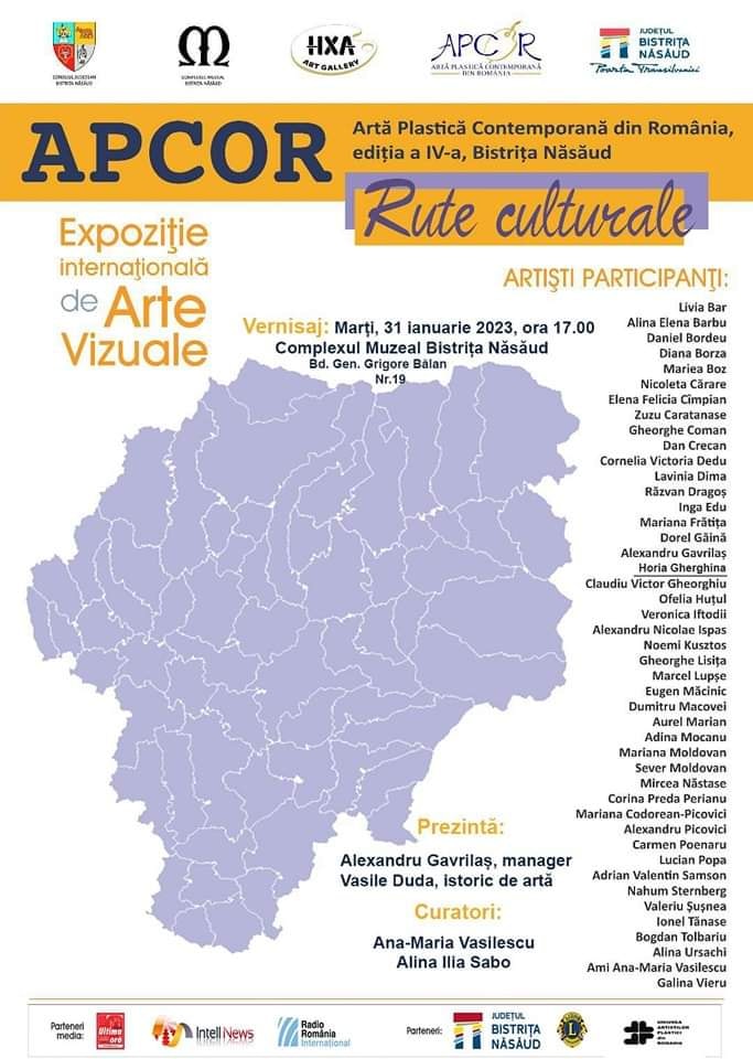 Asociația Culturală HXA Art Gallery în parteneriat cu Complexul Muzeal Bistrița-Năsăud organizează în data de 31 ianuarie 2023, ora 17.00, vernisajul Expoziției Internaționale de Arte Vizuale APCOR – Artă Plastică Contemporană din România cu titlul „RUTE CULTURALE”.