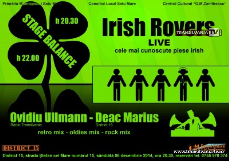 Sâmbătă, 6 decembrie 2014, ora 20.30 la District 15 – Stage Balance – concert live cu Irish Rovers (Carei) şi party cu Ovidiu Ullmann şi Marius Deac. Intrarea pe bază de rezervare la numărul de telefon 0755 970 344.