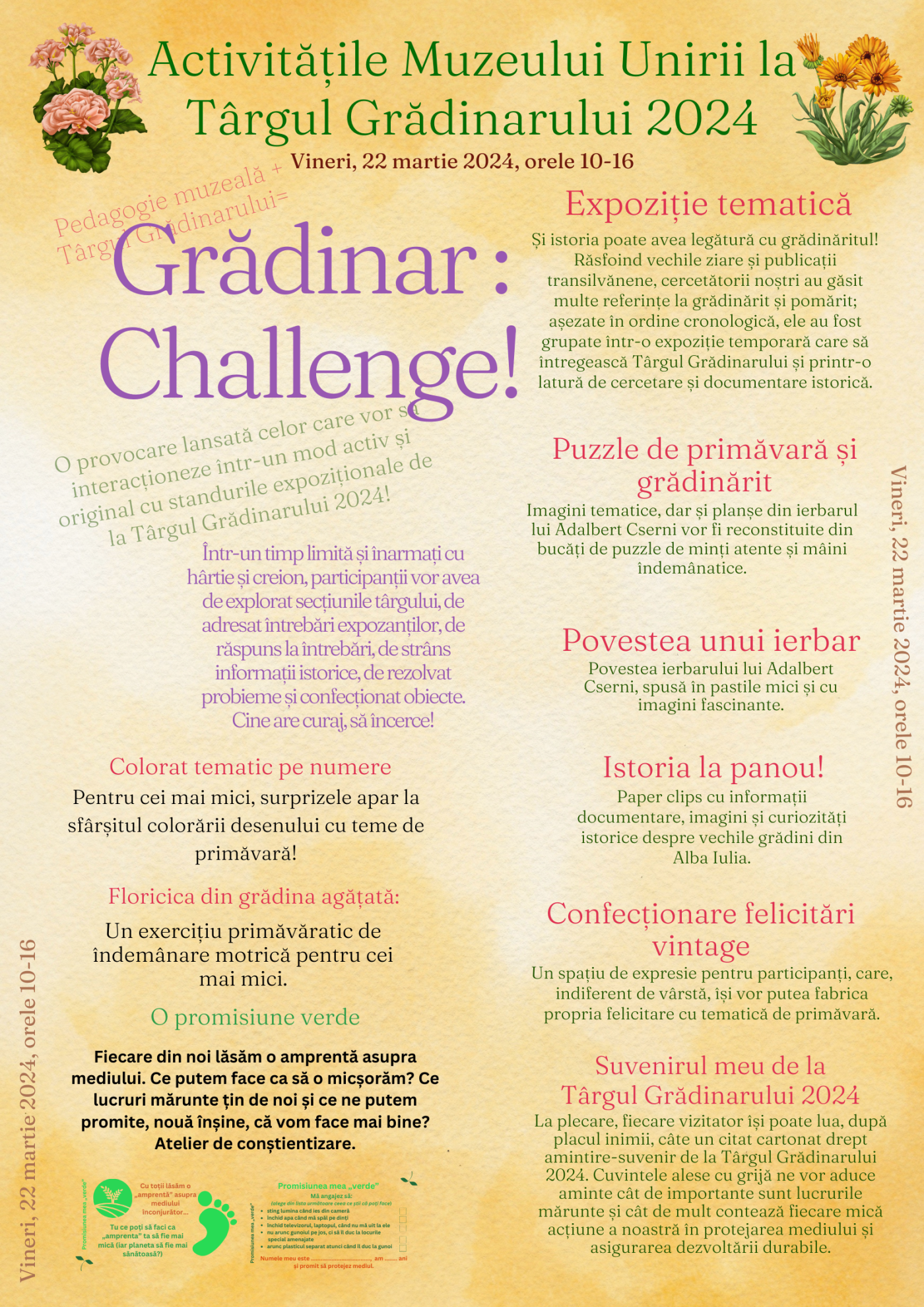 Vineri, 22 martie 2024, între orele 10 și 16, în cadrul Târgului Grădinarului, ediția 2024, Muzeul Național al Unirii Alba Iulia va întâmpina publicul cu o expoziție temporară tematică, completată de ateliere educative.Intitulată „Alte… fragmente din istoria grădinăritului în Transilvania, la sfârșitul secolului al XIX-lea”, expoziția va putea fi vizitată pe durata celor trei zile ale Târgului Grădinarului. Împletind pedagogia muzeală, cunoștințele istorice și îndemânarea, specialiștii de la secțiile Istorie și Museikon ale Muzeului Unirii vor derula de asemenea ateliere educative („Grădinar Challenge” – o provocare contratimp cu întrebări și răspunsuri din și despre Târgul Grădinarului; panouri cu informații și imagini istorice legate de spațiile verzi de odinioară, biografii și memorii ale unor botaniști transilvăneni; puzzle tematic și cu piese din patrimoniul muzeului); ateliere craft (confecționare felicitări vintage, colorat tematic pe numere, exerciții de motricitate fină) de conștientizare în vederea sustenabilității („O promisiune verde”). Evenimentul este organizat de Consiliul Județean Alba și de Muzeul Național al Unirii Alba Iulia.