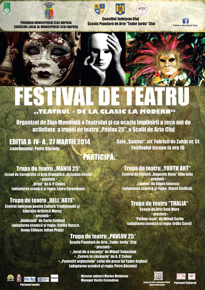 Cu ocazia Zilei Mondiale a Teatrului, Consiliul Judeţean Cluj, Primăria Municipiului Cluj-Napoca și Școala Populară de Arte „Tudor Jarda” Cluj organizează, joi, 27 martie 2014, un Festival de teatru al Școlilor de Arte, ediţia a IV-a, desfășurat sub genericul „Teatrul – de la clasic la modern”. Acest festival se adresează cursanților de la secțiile de teatru ale Școlilor de Arte, cât și celor din liceele de specialitate. Festivalul este, totodată, un prilej de aniversare a zece ani de activitate a trupei de teatru „Pavlov 25”, a Școlii de Arte Cluj. Manifestarea va avea loc în sala „Șantier” a Școlii Populare de Arte, strada Fabricii de Zahăr nr. 51, începând cu ora 16.