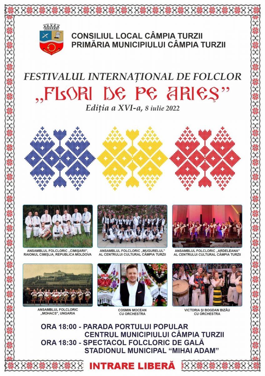 Primăria și Consiliul Local al Municipiului Câmpia Turzii organizează invită vineri, 8 iulie 2022, cea de-a XVI-a ediție a Festivalului Internațional de Folclor „Flori de pe Arieș”.