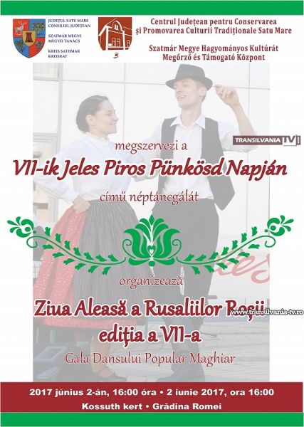 Centrul Judeţean pentru Conservarea şi Promovarea Culturii Tradiţionale cu sprijinul Consiliului Judeţean Satu Mare organizează vineri 2 iunie, de la ora 16:00 cea de-a VII- a ediţie a Festivalului Folcloric, „Rusaliile Rosii” – Gala dansului popular maghiar, la scena amplasată în Grădina Romei, unde formaţiile din judeţ își vor prezenta dansurile.
