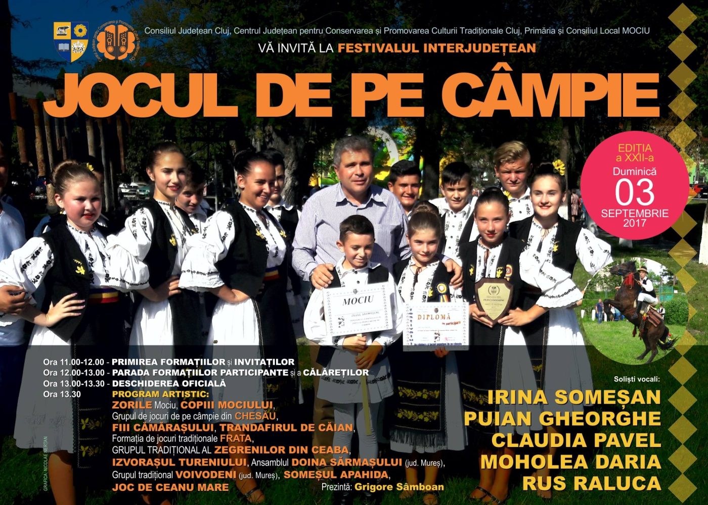 Centrul Judeţean pentru Conservarea şi Promovarea Culturii Tradiţionale Cluj, instituție de cultură aflată în subordinea Consiliului Județean Cluj, în parteneriat cu Primăria şi Consiliul Local Mociu organizează duminică, 3 septembrie 2017, în localitatea Mociu, un Știri folcloric reprezentativ pentru Câmpia Transilvană, Festivalul interjudețean „Jocu’ de pe Câmpie” – ediţia a XXII – a.