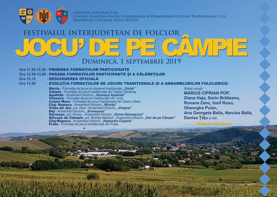 Mai multe formații de jocuri tradiționale și ansambluri folclorice din județele Cluj, Bistrița-Năsăud, Alba și Mureș vor evolua duminică, 1 septembrie 2019, în comuna clujeană Mociu, în cadrul unui Știri folcloric reprezentativ pentru Câmpia Transilvană, Festivalul „Jocu’ de pe Câmpie”.