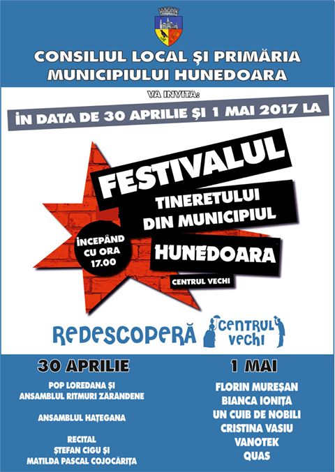 Consiliul Local și Primăria Municipiului Hunedoara organizează, în zilele de 30 aprilie și 1 mai 2017, Festivalul Tineretului. Evenimentul va avea loc în Centrul Vechi al orașului.