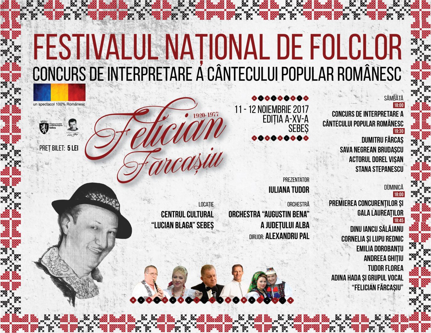 În perioada 10 – 12 noiembrie 2017, Sebeşul va găzdui cea de-a XV-a ediţie a Festivalului Naţional de Folclor „Felician Fărcaşiu” – Concurs de interpretare a cântecului popular românesc. Devenit deja o tradiţie, evenimentul aduce pe scena Centrului Cultural „Lucian Blaga” din Sebeş, locaţia de desfăşurare a evenimentului, cei mai îndrăgiţi interpreţi de folclor, dar şi tineri artişti dornici să se afirme şi să ducă mai departe moştenirea marelui culegător de folclor românesc, Felician Fărcaşiu. Festivalul este structurat în două secţiuni: prima secţiune vizează concursul de interpretare dedicat soliştilor vocali de muzică populară – amatori din întreaga ţară, având vârsta cuprinsă între 14-35 ani, iar cea de-a două secţiune vizează recitalurile artiştilor consacraţi.Programul Festivalului Naţional de Folclor „Felician Fărcaşiu”:Vineri, 10 noiembrie 2017:- ora 14,00: primirea oficiala a concurenţilor de către Primarul Municipiului Sebeş, Dorin Nistor;- ora 15,00: preselecţia concurenţilor înscrişi – înregistrarea audio a preselecţiei; comunicarea rezultatelor preselecţiei urmată de tragerea la sorţi a intrării în concurs; Sâmbătă, 11 noiembrie 2017:ora 10,00: lansare de carte, Casa Memorială “Lucian Blaga” din Lancrăm ora 11,30: repetiţiile concurenţilor cu orchestra ora 18,00: concurs de interpretare a cântecului popular românesc ora 19,30: recitaluri artişti consacraţiStana StepănescuDumitru FărcașDorel VișanSava Negrean BrudașcuDuminica, 12 noiembrie 2017:ora 11,00: deliberarea juriuluiora 18,00: premierea concurenţilor şi gala laureaţilorora 18,45: recitaluri artişti consacraţiAdina Hada și Grupul vocal “ Felician Fărcaşiu”Tudor FloreaAndreea GhițiuEmilia DorobanțuDinu Iancu SălăjanuCornelia și Lupu RednicSpectacolul va fi prezentat de Iuliana Tudor.Acompaniază: Orchestra “Augustin Bena” al Judeţului Alba, dirijor Alexandru Pal.Regulamentul Festivalului – concurs naţional de interpretare a cântecului popular românesc „FELICIAN FĂRCAŞIU”Obiectivul festivalului este acela de a descoperi şi promova noi talente interpretative, de a pune în valoare cântecul popular autentic şi de-al introduce în circuitul valorilor spirituale, de a realiza o prezentare nealterată a frumuseţii costumului popular din diferite zone culturale ale ţării.Condiţii de participare.La concurs sunt invitaţi să participe solişti vocali de muzică populară – amatori din întreaga ţară, având vârsta cuprinsă între 14-35 ani. Repertoriu.Atât la preselecţie, cât şi în concurs, soliştii vor prezenta două cântece, din zona din care provin, unul cu acompaniament orchestral, altul fără acompaniament orchestral (doină, bocet, baladă). Se va acorda un premiu special pentru cea mai bună interpretare a unei melodii din repertoriul lui Felician Fărcaşiu. Înscrierile.Concurenții vor interpreta două melodii reprezentative pentru zona etnofolclorică din care provin: prima melodie – fără acompaniament orchestral, cu ritm parlando-rubato (doină, bocet, cântec bătrânesc, cântec propriu-zis) și cea de-a doua melodie – cu acompaniament, cu ritm giusto-silabic, aksac sau de dans.Concurenții au obligația de a trimite, odată cu Fișa de înscriere, partitura muzicală, un link de trimitere către o înregistrare audio/video sau înregistrarea audio a melodiei cu acompaniament pe care doresc să o prezinte în concurs.Fișele de înscriere și partiturile muzicale/link-urile/înregistrările vor fi trimise, până cel târziu în data de 7 noiembrie 2017, ora 18.00, pe adresa Centrului Cultural „Lucian Blaga” Sebeş, bd. Lucian Blaga, nr. 45, cod poştal 515800, fax: 0258/732844, tel.: 0258/732939, sau prin e-mail la adresa: cclb_sebes@yahoo.com. Desfăşurarea concursului.Vineri, 10 noiembrie 2017, la ora 15.00, debutează preselecţia concurenţilor, care va avea loc la sediul Centrului Cultural „Lucian Blaga”, din Sebeş. Sâmbătă, 11 noiembrie 2017, la ora 11.30, vor începe repetiţiile concurenţilor cu orchestra, iar de la ora 18.00, concursul. Festivitatea de premiere şi gala laureaţilor vor avea loc duminică, 12 noiembrie 2017, de la ora 18.00.Concursul se va desfăşura sub forma unui spectacol cu public în sala ”Radu Stanca” a Centrului Cultural „Lucian Blaga” Sebeş.Ordinea intrării în concurs va fi stabilită prin tragere la sorţi.Câştigătorul marelui premiu va fi invitat de onoare pentru susţinerea unui recital la următoarea ediţie a festivalului.Unul din elementele de noutate pentru ediția din acest an este acela că publicul din sala de spectacol va avea posibilitatea să-și voteze interpretul favorit (căruia i se va acorda premiul de popularitate), prin intermediul unor formulare care vor fi oferite odată cu biletele de acces. Procedura de vot pentru premiul de popularitate se va încheia sâmbătă, 11 noiembrie, la ora 23.00.Juriul.Aprecierea concurenţilor va fi făcută de un juriu alcătuit din personalităţi ale vieţii culturale, specialişti în folclor muzical, etnografie, etc. Membrii juriului sunt: doamna Elise Stan, domnul Dumitru Fărcaș, doamna Gabriela Rusu Păsărin, doamna Doina Işfanoni, domnul Alexandru Pal, domnul Gelu Stan și, pentru prima oară, din juriu face parte și un urmaș din familia lui Felician Fărcașiu, doamna Lelia Irimie. Premiile.Organizatorii acordă următoarele premii, pe baza clasamentului stabilit de juriu:Marele premiul al festivalului: 5.000 lei Premiul I: 3.500 lei Premiul II: 2.000 lei Premiul III: 1.500 lei Un premiu special pentru interpretarea unei melodii din repertoriul lui Felician Fărcaşiu: 1.000 leiPremiul de popularitate: 1.000 lei Toate premiile sunt în valoare netă. Juriul are competența de a nu acorda sau de a redistribui premiile.Tuturor concurenţilor li se vor acorda diplome de participare.Festivalul Naţional de Folclor „Felic