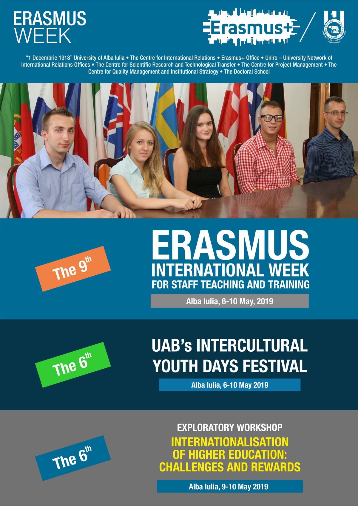 Centrul de Relaţii Internaţionale al Universităţii „1 Decembrie 1918” din Alba Iulia organizează în perioada 6-10 mai 2019 cea de-a șasea ediție a Festivalului Tineretului Intercultural, cea de-a noua ediție a Săptămânii Internaționale Erasmus și cea de-a șaseaediție a Workshop-ului exploratoriu Internationalisation of Higher Education: Challenges and Rewards, cu participarea studenților internaționali ai Universității și a unor cadredidactice, cercetători și specialiști din Bosnia și Herțegovina, Columbia, Polonia, Rusia,Uzbekistan, dar și a unor reprezentanți ai Agenției Naționale pentru Programe Comunitare înDomeniul Educației și Formării Profesionale (ANPCDEFP) și reprezentanți ai unor Universități din țară: Universitatea Tehnică din Cluj-Napoca, Universitatea de Petrol și Gazedin Ploiești, Universitatea Tehnică „Gheorghe Asachi” din Iași, USAMV Cluj-Napoca,Universitatea de Artă și Design din Cluj-Napoca.DESCHIDEREA EVENIMENTELOR – LUNI, 6 MAI 2019, ORA 11.00, AMFITEATRUL A9UAB organizează, de 6 ani, unworkshop exploratoriu pe tema internaționalizării învățământului superior, un festival al tineretului intercultural și, de 9 ani, o SăptămânăErasmus internațională. Anul acesta, cu ocazia Președinției României la Consiliul European șia Zilei Europei, vom organiza toate aceste trei evenimente în perioada 6-10 mai 2019, integrând atât studenții internaționali ai UAB, cât și partenerii noștri de peste hotare.UAB a dezvoltat în ultimii ani un sistem online integrat pentru managementul mobilitățilorErasmus incoming și outgoing, prin intermediul căruia am implementat dosarul electronic alparticipanților, ajungând la „Erasmus without papers”, o aplicație pe mobil disponibilă înGoogle Play – Erasmus UAB atât pentru studenți, cât și pentru staff, incoming și outgoing, unsistem online integrat pentru actualizarea în timp real a Course Catalogue și completareaonline a Learning Agreement for studies. Acestea sunt deziderate ale Comisiei Europene pe care UAB le-a implementat în ultimii ani cu resurse proprii. Sărbătorim, așadar, în perioada 6- 10 mai 2019, nu doar cultura, tradițiile, unicitatea studenților noștri internaționali și a țărilordin care provin, ci și diversitatea de bune practici în domeniul cercetării și al educației în învățământul superior.Merită menționat faptul că toate cele 3 evenimente sunt unice în România, UAB fiind singuraUniversitate care a transformat procesul de internaționalizare într-o preocupare academică menită să răspundă nevoilor practice ale unei strategii viabile de internaționalizare a învățământului superior, a oricărei instituții universitare cu adevărat interesată deinternaționalizarea serviciilor sale educaționale și de cercetare.