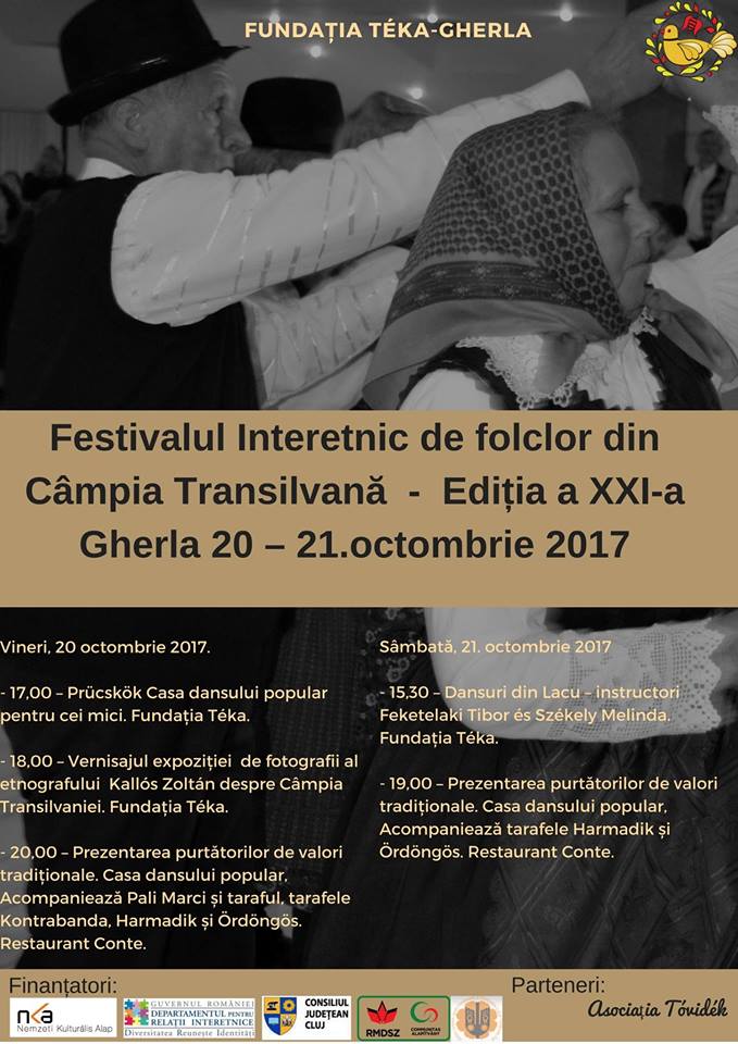 Centrul Județean pentru Promovarea și Conservarea Culturii Tradiționale Cluj, instituție de cultură care funcționează în subordinea Consiliului Județean Cluj, în colaborare cu Fundația Téka din Gherla, alături de Asociația Comunitară Tóvidek-Lacuri, organizează în perioada 20-21 octombrie 2017, cea de-a a XXI-a ediție a Festivalului Interetnic de Folclor din Câmpia Transilvaniei.