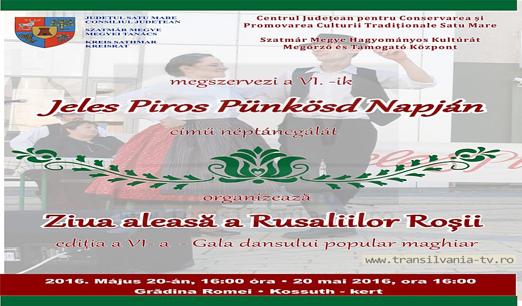 Centrul Judeţean pentru Conservarea şi Promovarea Culturii Tradiţionale, cu sprijinul Consiliului Judeţean Satu Mare organizează vineri, 20 mai, cea de-a VI-a ediţia a Galei dansului popular maghiar. Evenimentul va avea loc începând cu ora 16:00 în Grădina Romei.
