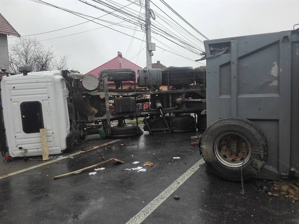 Detașamentul de Pompieri Baia Mare a intervenit astăzi pe DE 58, în localitatea Tăuții Măgherăuș în cazul unui accident rutier. Un TIR încărcat cu nisip s-a răsturnat peste un autoturism, blocând traficul pe ambele sensuri ale drumului.