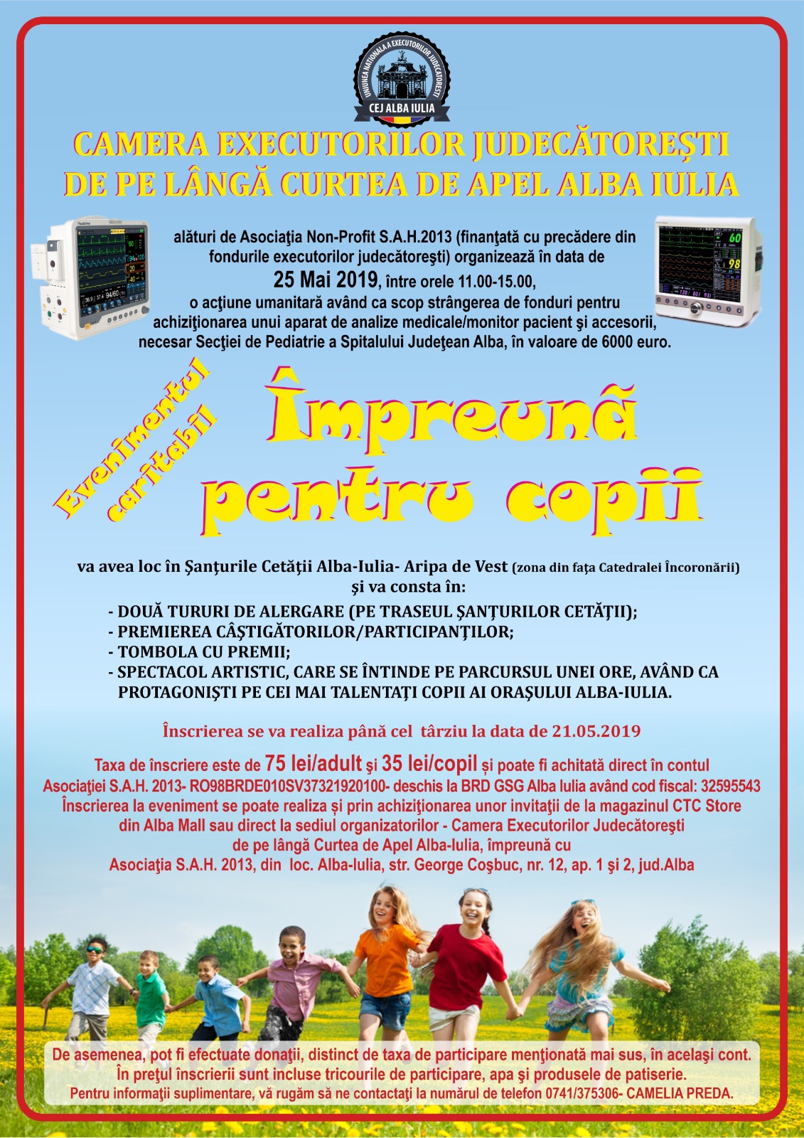 Copiii internati in Sectia Pediatrie a Spitalului Judetean Alba au nevoie urgenta de ajutorul nostru! Putem sa ne implicam si noi, participand in data de 25 mai 2019, intre orele 11,00- 15,00, in Santurile Cetatii, din fata Catedralei Reintregirii din Alba Iulia, la o actiune de strangere de fonduri. Evenimentul va consta in manifestari sportive, o tombola si un spectacol artistic de o ora, sustinut de cei mai talentati copii din oras. Cei care vor sa ajute, o pot face,participand la eveniment si achitand taxa de inscriere de 75 de lei de adult si 35 de lei de copil (insotit de cel putin un adult) sau donatiile, in contul Asociatiei Non Profit S.A.H 2013, RO98BRDE010SV37321920100 deschis la BRD Alba Iulia. Mai multe amanunte puteti obtine de la Camelia Preda, la telefon 0741375306 sau la sediul Camerei Executorilor Judecatoresti de pe langa Curtea de Apel din Alba Iulia de pe strada George Cosbuc, nr 12 (langa Tribunalul Alba), organizatorul actiunii de strangere a 6.000 de euro pentru achizitionare unui aparat de analize medicale, fara care, viata copiilor internati la Spitalul Judetean Alba, este in pericol.Iosif Gligor
