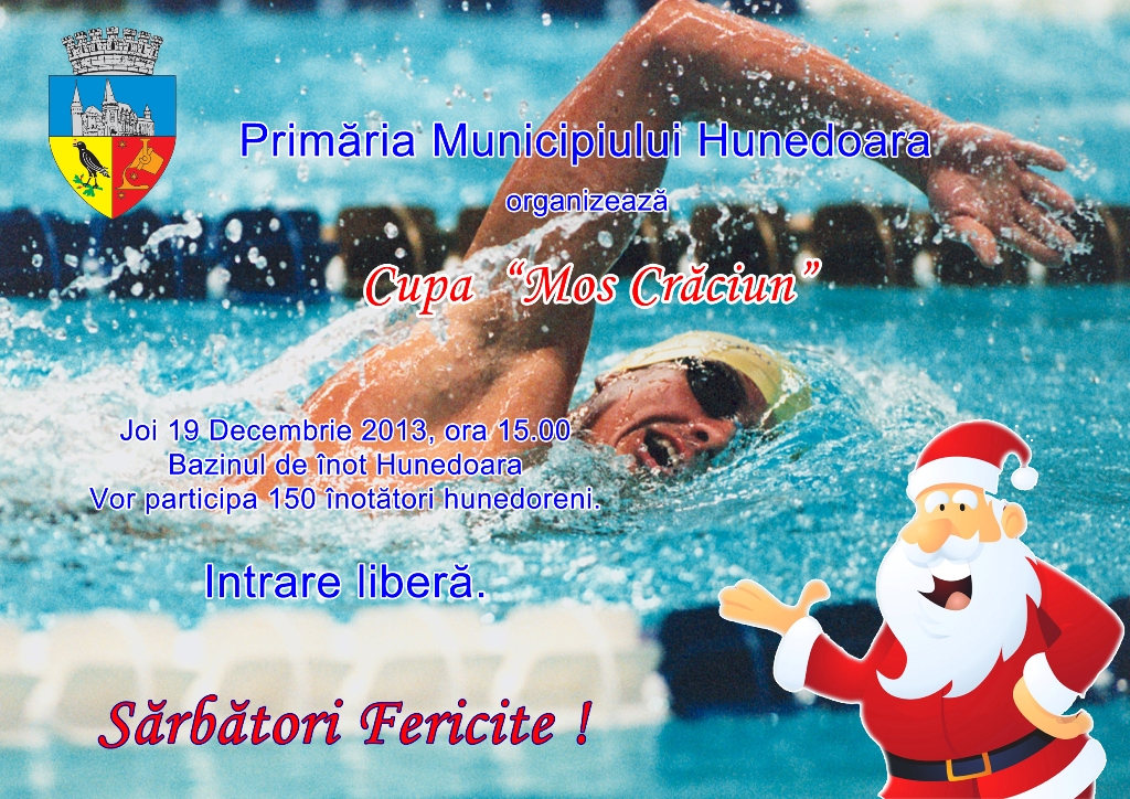Primăria Municipiului Hunedoara organizează joi, 19 decembrie 2013, concursul de înot Cupa „Moş Crăciun”. Competiţia va începe la ora 15.00 la Bazinul de Înot Hunedoara; participă 150 înotători hunedoreni.