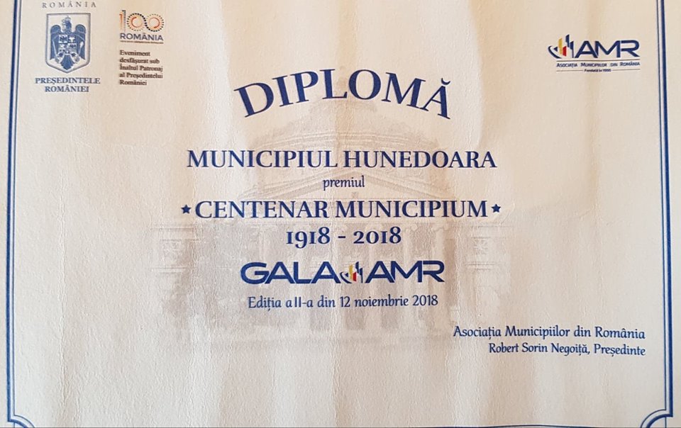 În cadrul Galei de Excelență a AMR – Asociaţia Municipiilor din România, eveniment anual care premiază cele mai bune administrații locale din țară, municipiul Hunedoara a fost distins cu premiul „CENTENAR MUNICIPIUM”, pentru activitatea pe care a desfășurat-o în acest an în care sărbătorim 100 de ani de la Marea Unire. Hunedoara a fost premiată alături de municipiile Ploiești, Buzău, Focșani și Roman, cu acest premiu special „CENTENAR MUNICIPIUM”, pentru activitatea desfășurată în An Centenar.