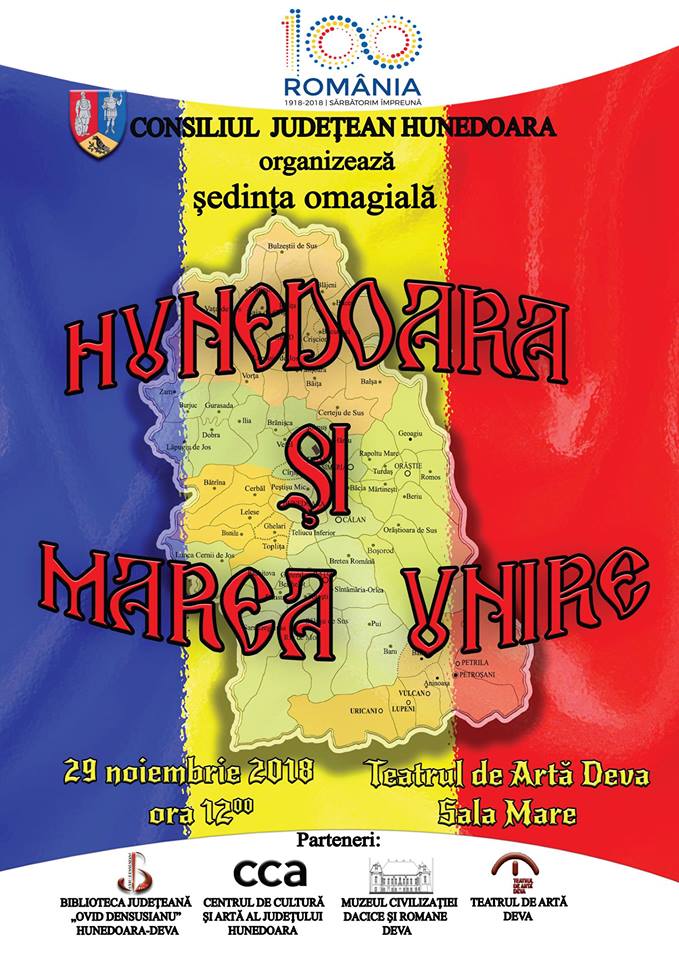 Consiliul Județean Hunedoara, în parteneriat cu Biblioteca Județeană „Ovid Densusianu” Hunedoara-Deva, Centrul de Cultură și Artă al Județului Hunedoara, Muzeul Civilizației Dacice și Romane Deva și Teatrul de Artă Deva, cinstește Centenarul Marii Uniri printr-o ședință omagială intitulată Hunedoara și Marea Unire, menită să evoce, cu emoție și recunoștință, mărețul act de la 1 Decembrie 1918, punct de cotitură în istoria României.