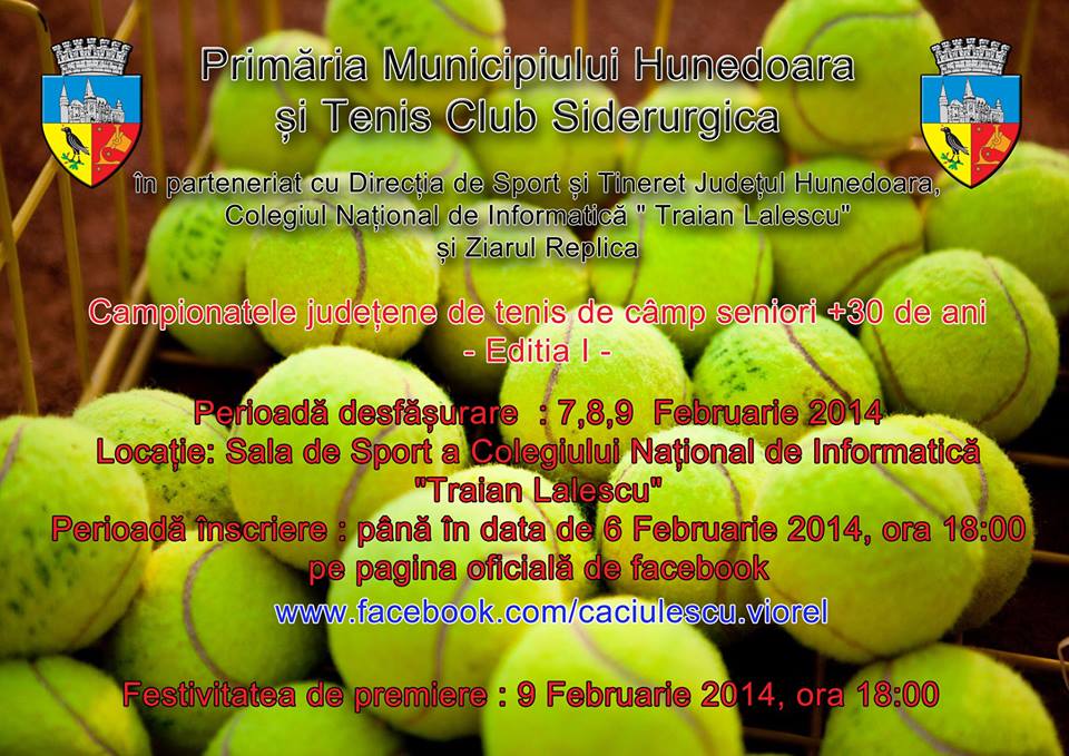 Tenis Club Siderurgica împreună cu Primăria Municipiului Hunedoara organizează în perioada 7-9 februarie 2014, ediția I a Campionatelor Județene de Tenis de Câmp, rezervate seniorilor + 30 ani, indoor, desfășurate în Sala de Sport a Colegiului Național de Informatică „Traian Lalescu”.