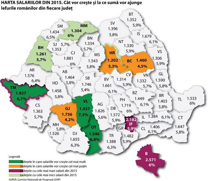 În 2015, cei mai bine plătiţi angajaţi din economie continuă să fie cei din Bucureşti şi din judeţul Ilfov, cu salarii medii nete de 2.571 de lei, respectiv de 2.182 de lei, ei fiind urmaţi în clasament de Timiş, cu salarii medii nete de 1.927 de lei în 2015.