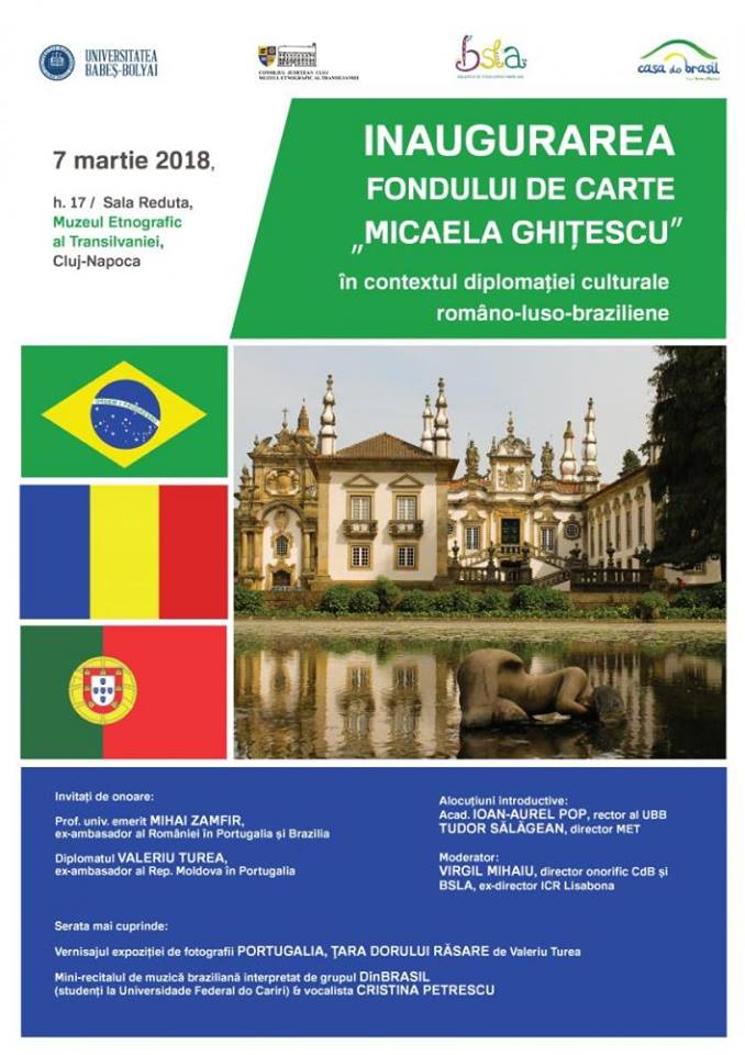 Apreciata traducătoare de literatură luso-braziliană Micaela Ghițescu a decis să-și doneze propria bibliotecă de specialitate, acumulată de-a lungul vieții, Centrului Cultural CASA DO BRASIL și Bibliotecii de Studii Latino-Americane din Cluj. Ambele instituții ființează sub patronajul principalei Universități Clujene (fondată în 1581). Spre a celebra nobilul gest al doamnei Ghițescu, clujenii sunt invitați să participe la serata intitulată Inaugurarea Fondului de Carte „Micaela Ghițescu” în contextul diplomației culturale româno-luso-braziliene, ce va avea loc la Muzeul Etnografic al Transilvaniei, miercuri, 7 martie 2018, începând cu ora 17.00.