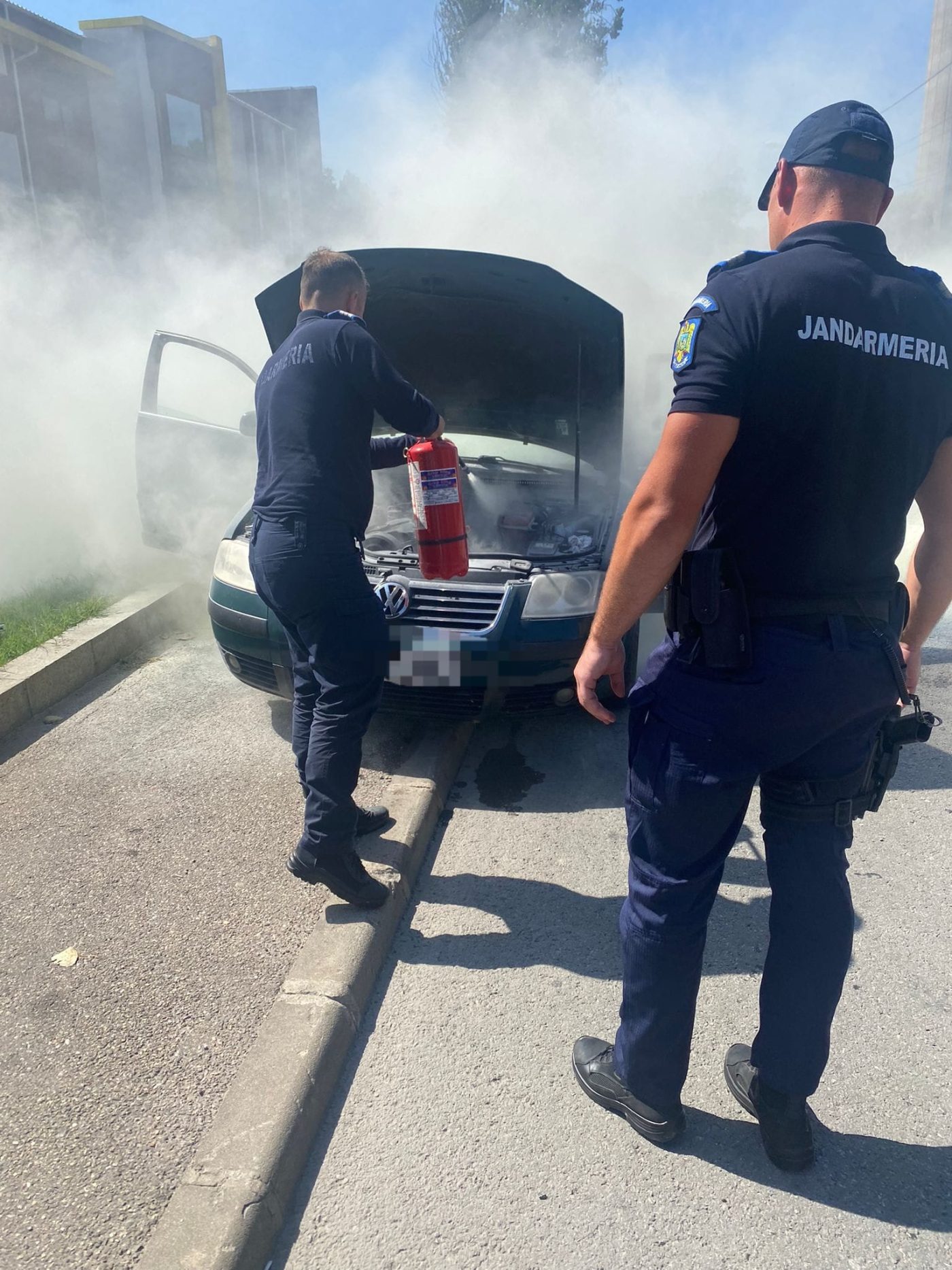 Jandarmii din cadrul Detașamentului 1 Mobil Bistrița aflați într-o acțiune de patrulare pe strada Romană din municipiul Bistrița, au observat un bărbat care împingea un autoturism de sub capota căruia ieșea un fum gros.
