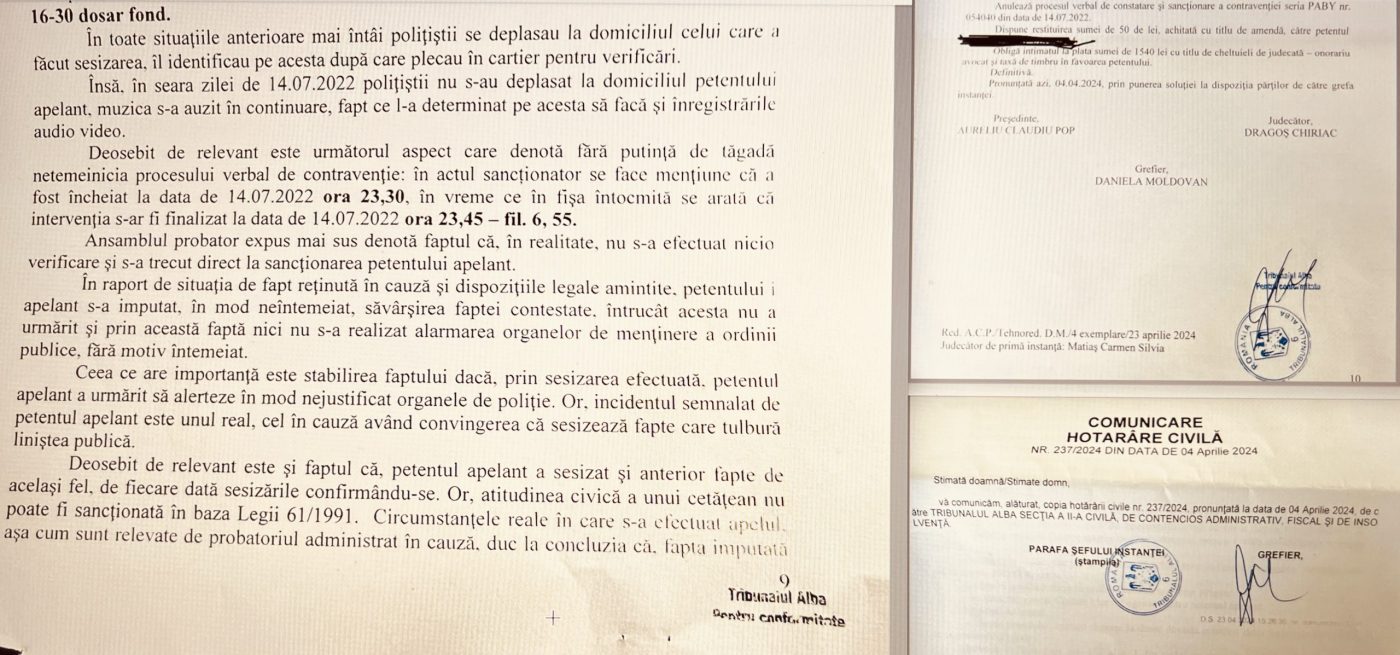 Incredibil la ce se preteaza unii politisti, mizand pe faptul ca cetatenii nu cunosc legea sau evita sa-i dea in judecata! Iata un caz concret. In urma cu doi ani, un localnic din Sebes a reclamat la 112, de mai multe ori, galagia, muzica si scandalurile care se auzeau noaptea tarziu in cartierul romilor. Politistii au intervenit si i-au linistit pe petrecareti, dar deranjati probabil, de apelurile ce se repetau, unul dintre acestia, Ag. Sef Boca Adrian a facut un abuz grav, asa cum precizeaza Tribunalul Alba. In data de 14.07.2022, la miezul noptii, cand localnicul a semnalat din nou, la 112, galagia din cartier, asa cum se precizeaza in Hotararea Civila nr. 237/2024 a Tribunalului Alba,(vezi foto) care este definitiva: ,,nu s-a efectuat nicio verificare si s-a trecut direct la sanctionarea petentului apelant.” Adica, politistul Boca Adrian l-a amendat pe reclamat, fara sa faca verificarile de rigoare. Probabil ca a incercat astfel sa-l pedepseasca, ca sa nu mai sune pe viitor! Noroc ca reclamatul s-a adresat instantei de judecata care a constatat marsavia. Grav este faptul ca reclamantul a sesizat si Biroul Control Intern din cadrul IPJ Alba, cu abuzurile politstului Boca Adrian, dar politistii de la Biroul Control Intern l-au declarat nevinovat. Adica nu au vrut sa vada ceea ce era evident, asa cum precizeaza Tribunalul Alba: ,,Deosebit de relevant este urmatorul aspect care denota fara putinta de tagada netemeinicia procesului verbal de contraventie: in actul sanctionator se face mentiunea ca a fost incheiat la data de 14.07.2022 ora 23,30 in vreme ce in fisa intocmita se arata ca interventia s-a finalizat la data de 14.07.2022 ora 23,45 – fila 6,55. Ansamblu probator expus mai sus denota faptul ca, in realitate, nu s-a efectuat nicio verificare si s-a trecut direct la sanctionarea petentului apelant.” Vorba aia romaneasca: ,,corb la cob nu-si scote ochii!” Cea ce este deosebit de grav si periculos, este ca aceasta practica sfidatoare, aceste abuzuri crase ale politistilor, s-au inmultit. Mai multi oameni din Sebes (si nu numai), care au reclamat situatii asemanatoare, au fost amendati abuziv de catre politistii corupti, care incearca astfel sa-i sperie si sa-i determine sa nu mai sune la 112. Din pacate, majoritatea reclamantilor prefera sa plateasca amenda, ca sa nu-si mai piarda timpul prin instante, sa plateasca avocat, taxa de timbru etc., chiar daca abuzul este evident! Se pare ca, unii dintre acesti politisti, care fac de ras Politia Romana, mizeaza tocmai pe aceste aspecte. Solicitam inca o data sefilor IPJ Alba, ( https://alba.transilvania-tv.ro/cerem-excluderea-din-politia-sebes-a-ag-sef-boca-adrian-pentru-abuz-in-serviciu-astfel-de-oameni-nu-au-ce-cauta-in-politie/) sa ia masuri imediate impotriva politistului Boca Adrian care a recurs la astfel de abuzuri si din cauza caruia, acum, IPJ Alba trebuie sa plateasca amenda abuziva, cheltuielile de judecata si onorariul avocatului. Astfel de angajati nu fac cinste Politiei Romane!