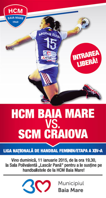 Duminică, 11 ianuarie, de la ora 19.30, are loc meciul dintre HCM Baia Mare, liderul clasamentului, şi SCM Craiova, ocupanta locului 2. Partida este programată de a 14-a etapă din Liga Naţională, prima din retur. Intrarea spectatorilor la acest joc este liberă. Partida va fi condusă de arbitrii Bogdan Stark (Bucureşti) şi Romeo Ştefan (Prahova), în timp ce D. Dordea (Sibiu) este observatorul desemnat de Federaţia Română de Handbal.