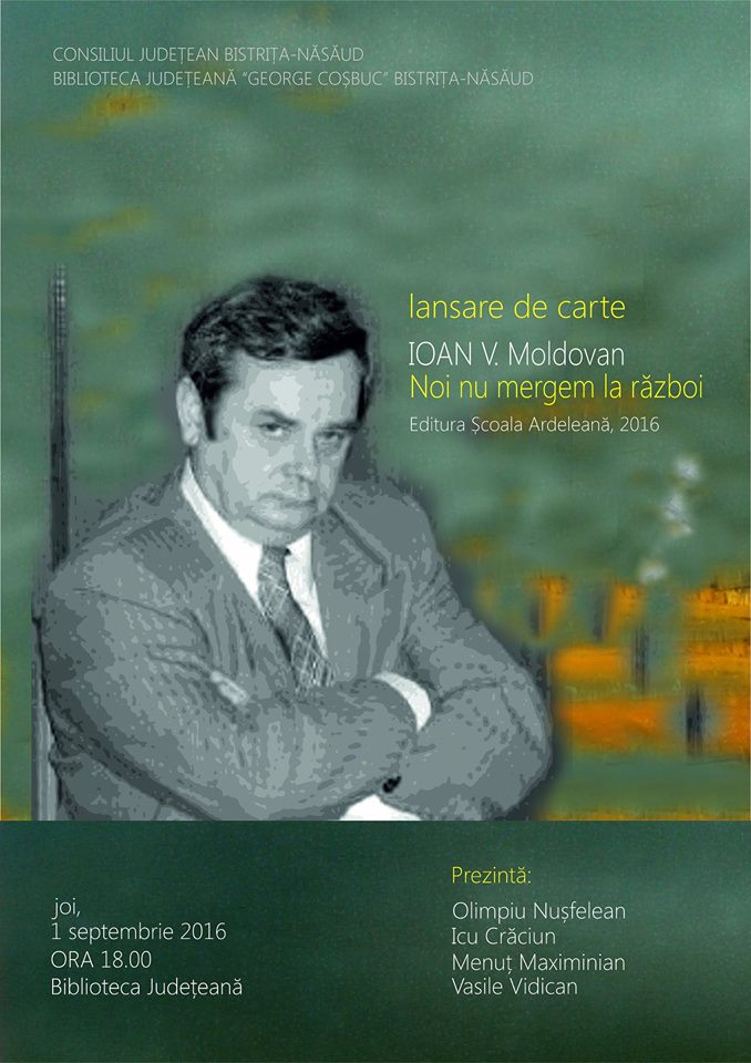 Consiliul Județean Bistrița-Năsăud, Biblioteca Județeană „George Coșbuc” Bistrița-Năsăud organizează joi, 1 septembrie 2016, ora 18:00, la Biblioteca Județeană (str. Alexandru Odobescu, nr. 11), lansarea de carte: Ioan V. Moldovan – „Noi nu mergem la război” (Editura Școala Ardeleană, 2016).