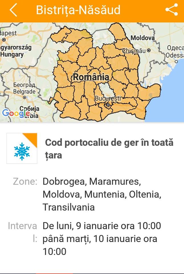 Județul Bistrița—Năsăud se află sub incidența unui cod portocaliu de ger, în intervalul 9 ianuarie , ora 10.00 — 10 ianuarie , ora 10.00. În aceste condiții, recomandăm să porniți la drum doar dacă este necesar. Dacă, totuși, nu puteți amâna călătoria, luați-vă toate măsurile de siguranță!