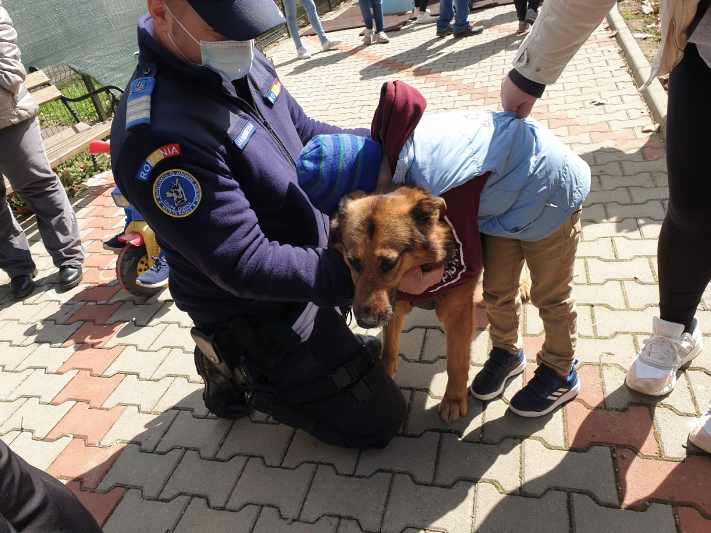Toți au fost deopotrivă nerăbdători să se pozeze sau să o îmbrățișeze cu căldură pe Sașa, unul dintre câinii de serviciu ai Jandarmeriei bistrițene, sau să probeze căștile sau scuturile de protecție ale acestora.