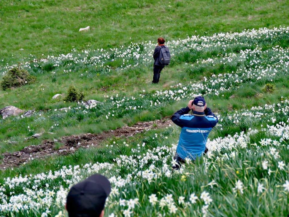 Narcisele de pe Vf. Saca se află în plină perioadă de înflorire. La acest sfârșit de săptămână unii turiști au parcurs traseul până sus în poiană, la 1.600 m altitudine.