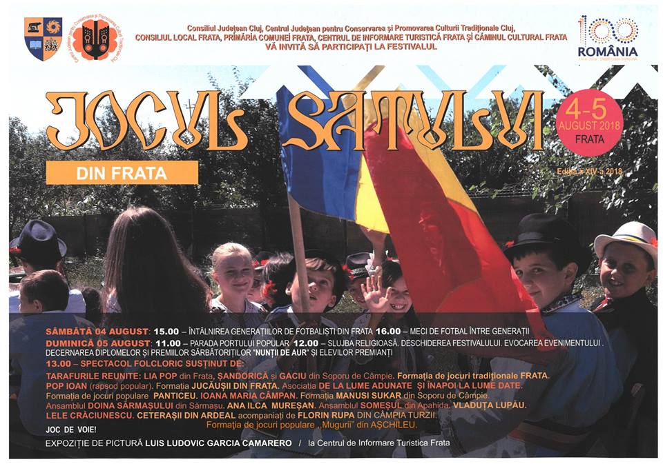 Centrul Județean pentru Conservarea și Promovarea Culturii Tradiționale Cluj, instituție de cultură care funcționează în subordinea Consiliului Județean Cluj, împreună cu Primăria și Consiliul Local Frata, Centrul de Informare Turistică și Căminul cultural Frata, invită publicul iubitor de folclor, în acest sfârșit de săptămână, la Festivalul Jocul Satului din Frata.