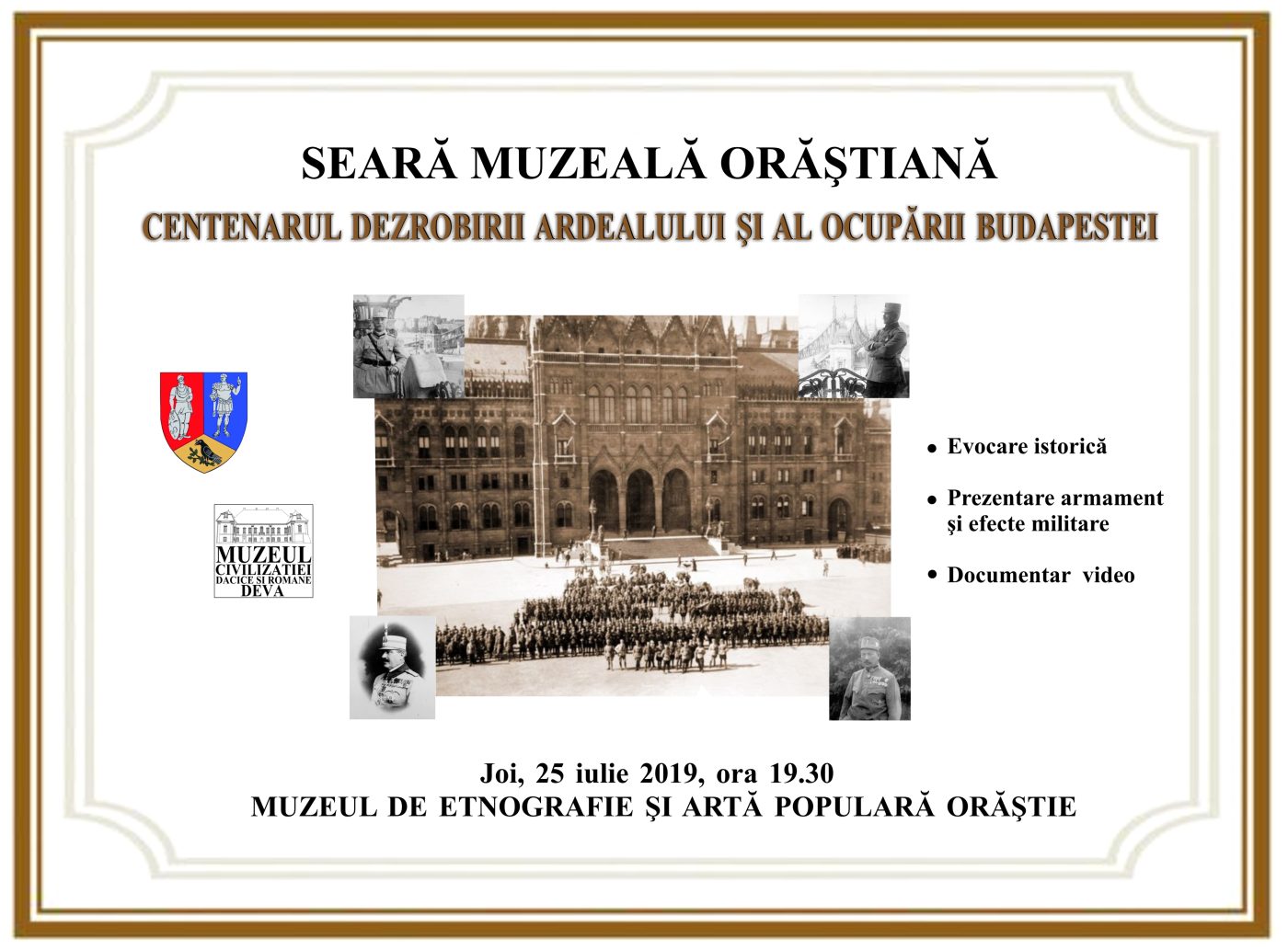 Prima pagină Joi 25 iulie, orele 19.30, “Seara muzeală orăștiană – 100 de ani de la campania militară a Armatei Române din 1919”.