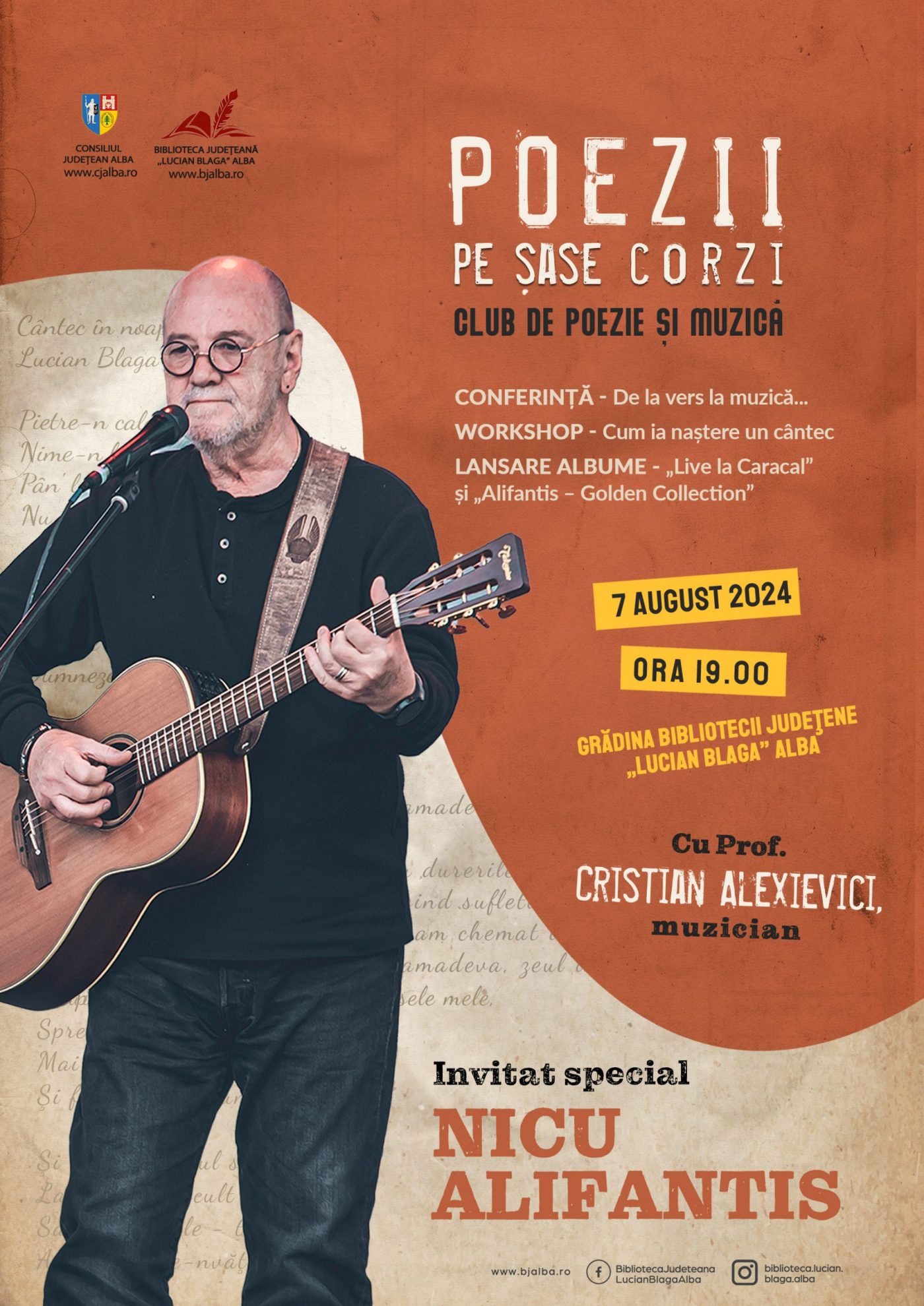 Miercuri, 7 august 2024, Biblioteca Județeană „Lucian Blaga” Alba vine în întâmpinarea iubitorilor de poezie și muzică cu un nou eveniment cultural ce face parte din proiectul 3.25 Poezii pe șase corzi. Încă de la prima sa ediție, acest proiect a fost gândit sub forma unui club de muzică și poezie în care cei prezenți pot asista la prestațiile artistice ale invitaților speciali, iar cei mai curajoși își pot pune în practică veleitățile artistice prin prezentarea propriilor compoziții și interpretări muzicale. Evenimentul din 7 august 2024, va începe la ora 19:00 și va avea loc în grădina Bibliotecii Județene „Lucian Blaga” Alba de pe strada Trandafirilor, nr. 22, din Alba Iulia, avându-l ca invitat de onoare pe muzicianul Nicu Alifantis. Punctele forte ale întâlnirii sunt conferința cu titlul „De la vers la muzică…”, workshop-ul cu titlul „Cum ia naștere un cântec” și lansarea albumelor „Live la Caracal” și „Alifantis – Golden Collection”, toate cele trei momente fiind susținute de Nicu Alifantis și moderate de muzicianul albaiulian Cristian Alexievici. Clubul de poezie și muzică „Poezii pe șase corzi” se va încheia cu un dialog constructiv între muzicianul Nicu Alifantis și public, cu întrebări, răspunsuri, opinii, încurajări, idei și sfaturi. Totodată, participanții vor avea posibilitatea să beneficieze de recomandări de cărți și alte publicații tematice, care pot fi împrumutate din colecția Bibliotecii Județene „Lucian Blaga” Alba.Proiectul 3.25 Poezii pe șase corzi este organizat de Consiliul Județean Alba și Biblioteca Județeană „Lucian Blaga” Alba. Intrarea la eveniment este liberă iar cei prezenți pot achiziționa albume cu dedicație din partea invitatului special.
