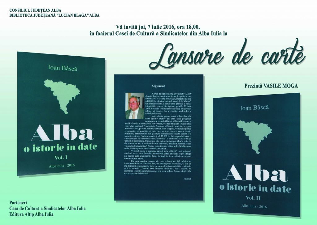 ”Trecutul este fereastra viitorului” scria Hașdeu. O asemenea fereastră deschidem și noi prin acest volum. Așadar, uitați-vă în trecut pentru a zări viitorul! sunt cuvintele de final ale argumentului adus de autor cărții pe care ne-o propune și pe care vrem să v-o oferim. Pentru acest lucru Consiliul Județean Alba și Biblioteca Județeană ”Lucian Blaga„ Alba vă invită joi, 7 iulie 2016, orele 18,00, în foaierul Casei de Cultură a Sindicatelor din Alba Iulia, pentru a fi martori la lansarea celor două volume semnate de IOAN BÂSCĂ – Alba – o istorie în date, care vor fi prezentate de istoricul VASILE MOGA. Partenerii acestui demers cultural ne sunt Casa de Cultură a Sindicatelor din Alba Iulia și Editura Altip din Alba Iulia.De asemenea, aceleași volume vor fi lansate și la Sebeș, unde ni se alătură în organizare Biblioteca Municipală ”Lucian Blaga„ Sebeș, Primăria Municipiului Sebeș și Consiliul local Sebeș, alături de partenerii evenimentului: Centrul Cultural ”Lucian Blaga„ Sebeș și Editura Altip din Alba Iulia.Lansare va avea loc joi, 14 iulie, orele 18,00, la Centrul Cultural ”Lucian Blaga„ din Sebeș. Aici volumele vor fi prezentate de MIOARA POP, director al bibliotecii județene.