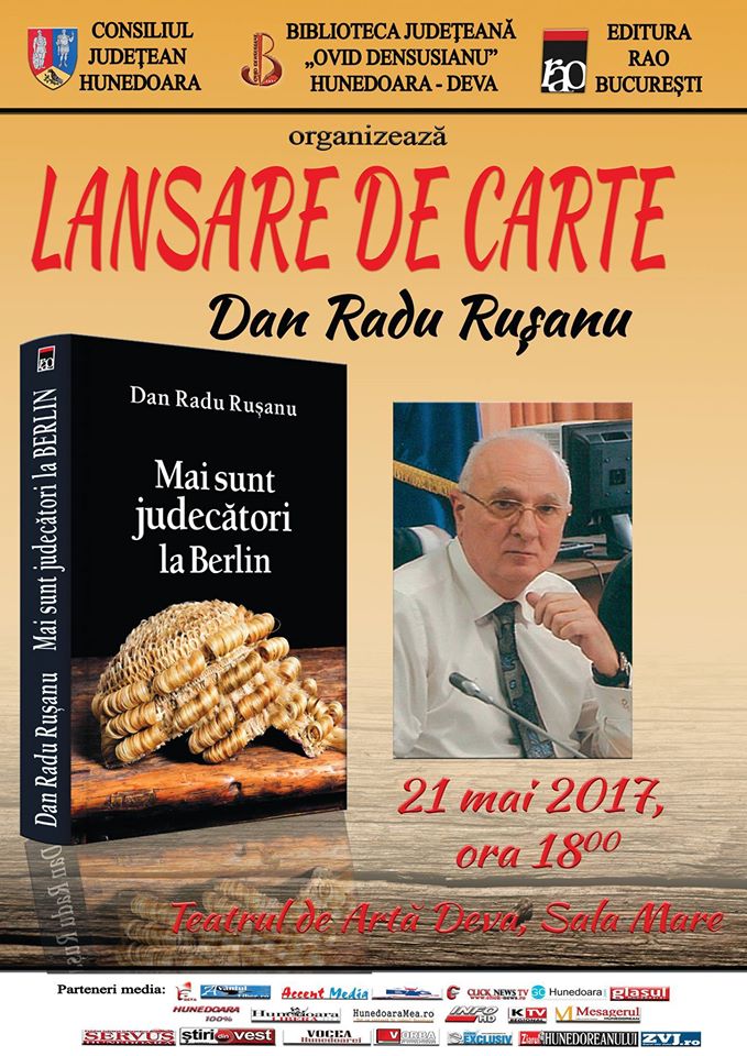 Biblioteca Județeană „Ovid Densusianu” Hunedoara-Deva, cu sprijinul Consiliului Județean Hunedoara și în parteneriat cu Editura RAO, organizează în ziua de 21 mai 2017, ora 18.00, în Sala Mare a Teatrului de Artă din Deva, un eveniment editorial cu totul remarcabil: lansarea cărții „Mai sunt judecători la Berlin”, semnată de Dan Radu Rușanu.
