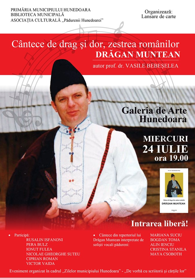 Primăria municipiului Hunedoara, Asociația Culturală „Pădurenii Hunedoarei” și Biblioteca Municipală organizează lansarea cărții „Cântece de drag şi dor, zestrea românilor – DRĂGAN MUNTEAN” – autor prof. dr. VASILE BEBEŞELEA.