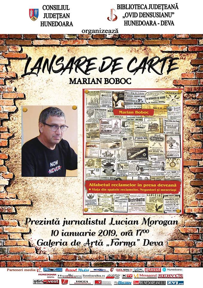 Biblioteca Județeană „Ovid Densusianu” Hunedoara-Deva, cu sprijinul Consiliului Județean Hunedoara, organizează în ziua de 10 ianuarie 2019, ora 17.00, la Galeria de Artă „Forma” din Deva, un eveniment editorial deosebit: lansarea volumului intitulat „Alfabetul reclamelor în presa deveană. Viața din spatele reclamelor. Negustori și meseriași”, al cărui autor este jurnalistul și scriitorul Marian Boboc.