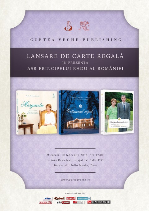 ASR Principele Radu al Romaniei va fi prezent in Deva, miercuri 12 februarie, unde va lansa cele mai recente volume regale publicate la editura Curtea Veche: „MARGARETA. PORTRETUL PRINCIPESEI MOSTENITOARE”, „TREI PODURI PESTE LUME” si „CRACIUNUL REGAL” . Evenimentul va avea loc in incinta Deva Mall, la etajul IV, in Salle d’Or. Intrarea este libera, iar evenimentul va include si o sesiune de autografe.