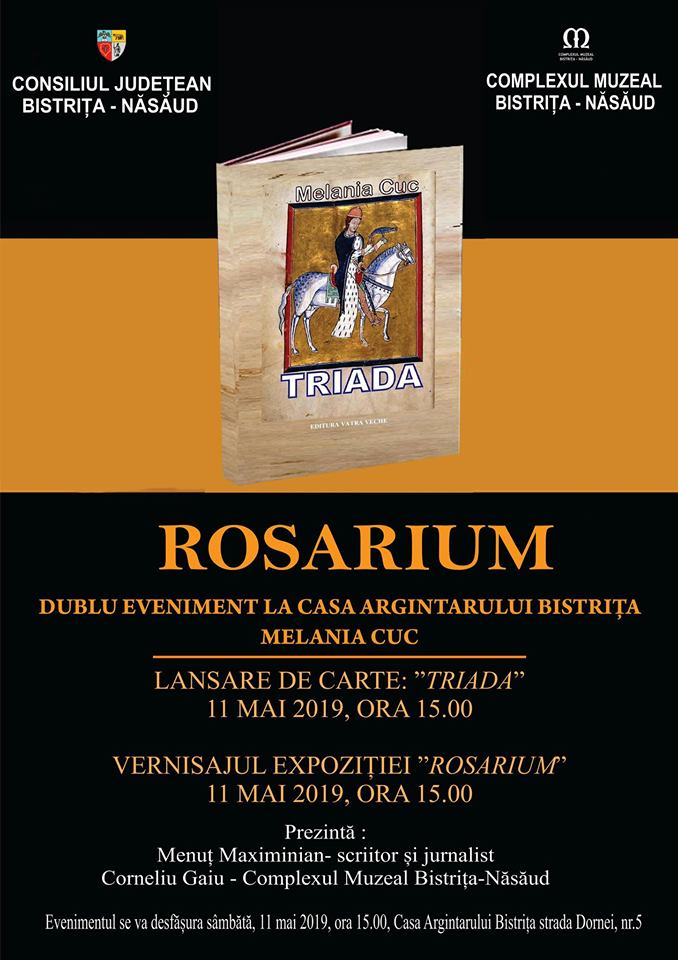 Melania Cuc – poetă, prozatoare, ziaristă, eseistă, pictoriță, este protagonista unui dublu eveniment: lansarea cărții ”Triada”și vernisajul expoziției personale, intitulat ”Rosarium”. Prezintă: – Menuț Maximinian – scriitor și jurnalist – Corneliu Gaiu – istoric, Complexul Muzeal Bistrița-Năsăud