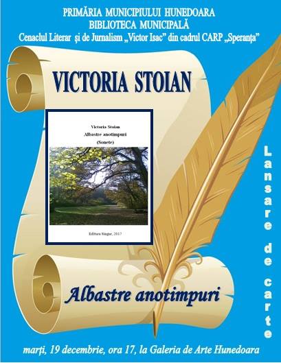 Victoria Stoian, inginera îndrăgostită de versuri, își lansează la Galeria de Arte din Hunedoara, marți, 19 decembrie 2017, începând cu ora 17, volumul de sonete: „Albastre anotimpuri”.