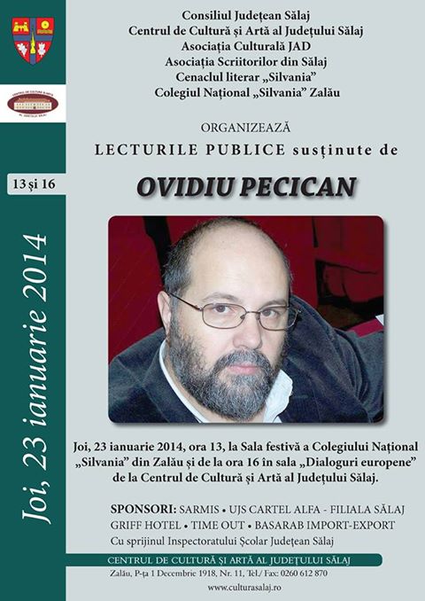 Centrul de Cultură și Artă al Județului Sălaj, Asociația culturală Jad, Asociația Scriitorilor din Sălaj, Cenaclul literar „Silvania” și Colegiul Național „Silvania” din Zalău îi invită pe iubitorii de literatură joi, 23 ianuarie 2014, la lecturile publice susținute de prof. univ. dr. Ovidiu Pecican: de la ora 13 în Sala Festivă de la CNS Zalău și de la ora 16 în sala „Dialoguri europene” de la Centrul de Cultură și Artă al Județului Sălaj. Sponsori: Sarmis, UJS „Cartel Alfa” filiala Sălaj, Griff Hotel, Time Out, Basarab Import – Export. Cu sprijinul Inspectoratului Școlar al Județului Sălaj.