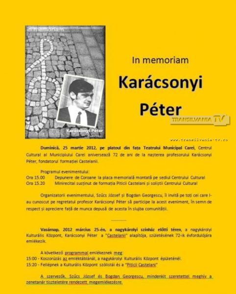 Un profesionist desăvârșit, un muzician de excepție, profesor și om de cultură care în urmă cu doisprezece ani, într-o zi de toamnă de 20 octombrie a trecut la cele veșnice. Aceasta e o descriere în doar câteva cuvinte a celui ce a fost și va rămâne mereu în amintirea careienilor, sătmărenilor și românilor, maestrul Karacsonyi Peter.Karácsonyi Péter s-a născut la 25 martie 1940 în Budapesta. A susținut examenul de Bacalaureat în anul 1956 la Carei, în 1959 obținând diploma în electrotehnică, la Timișoara, apoi la Cluj, în 1962, diploma în construcții. În 1965 devine absolvent al cursurilor de pedagogie, iar câțiva ani mai târziu, în 1971 termină cursurile Academiei de Muzică “Gheorghe Dima” din Cluj Napoca, Facultatea de Compoziție și Muzicologie. În 1978 obține diploma de dirijor, iar în 1983 i se acordă diplomă de merit din partea Ministerului Educației, iar în 1994 îi este oferit premiul de Excelență în Cultură. În 2005, în semn de apreciere pentru contribuția excepțională adusă în viața muzicală careiană, primește post mortem titlul Pro Urbe.