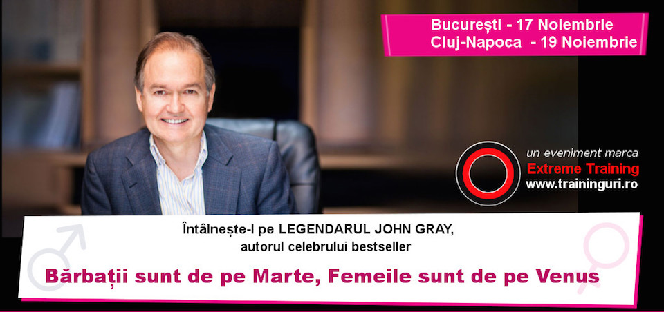 Legendarul JOHN GRAY, autorul bestseller-ului “BĂRBAȚII SUNT DE PE MARTE, FEMEILE SUNT DE PE VENUS”, vine pentru prima dată în România, în data de 17 noiembrie 2015, pentru a susține o conferință cu adevărat specială, în cadrul căreia, femeile, bărbații sau cuplurile pot afla secrete care funcționează pentru a-și îmbunătăți radical și imediat relațiile. Evenimentul este organizat de Extreme Training atât în București (17 noiembrie) cât și în Cluj-Napoca (19 noiembrie).