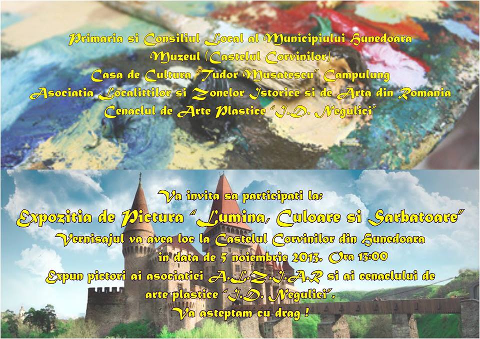Primăria Municipiului Hunedoara organizează vernisajul expoziţiei de pictură „Lumină, Culoare şi Sărbătoare”, ce va avea loc în data de 5 noiembrie 2013, ora 13.00, la Castelul Corvinilor.