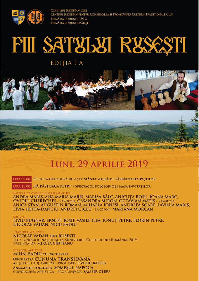 Centrul Judeţean pentru Conservarea şi Promovarea Culturii Tradiţionale Cluj, instituție de cultură aflată în subordinea Consiliului Judeţean Cluj, împreună cu primările comunelor Râșca și Mărișel, invită toţi iubitorii de folclor luni, 29 aprilie 2019, în a doua zi de Paști, la prima ediție a Sărbătorii „Fiii satului Rusești”.