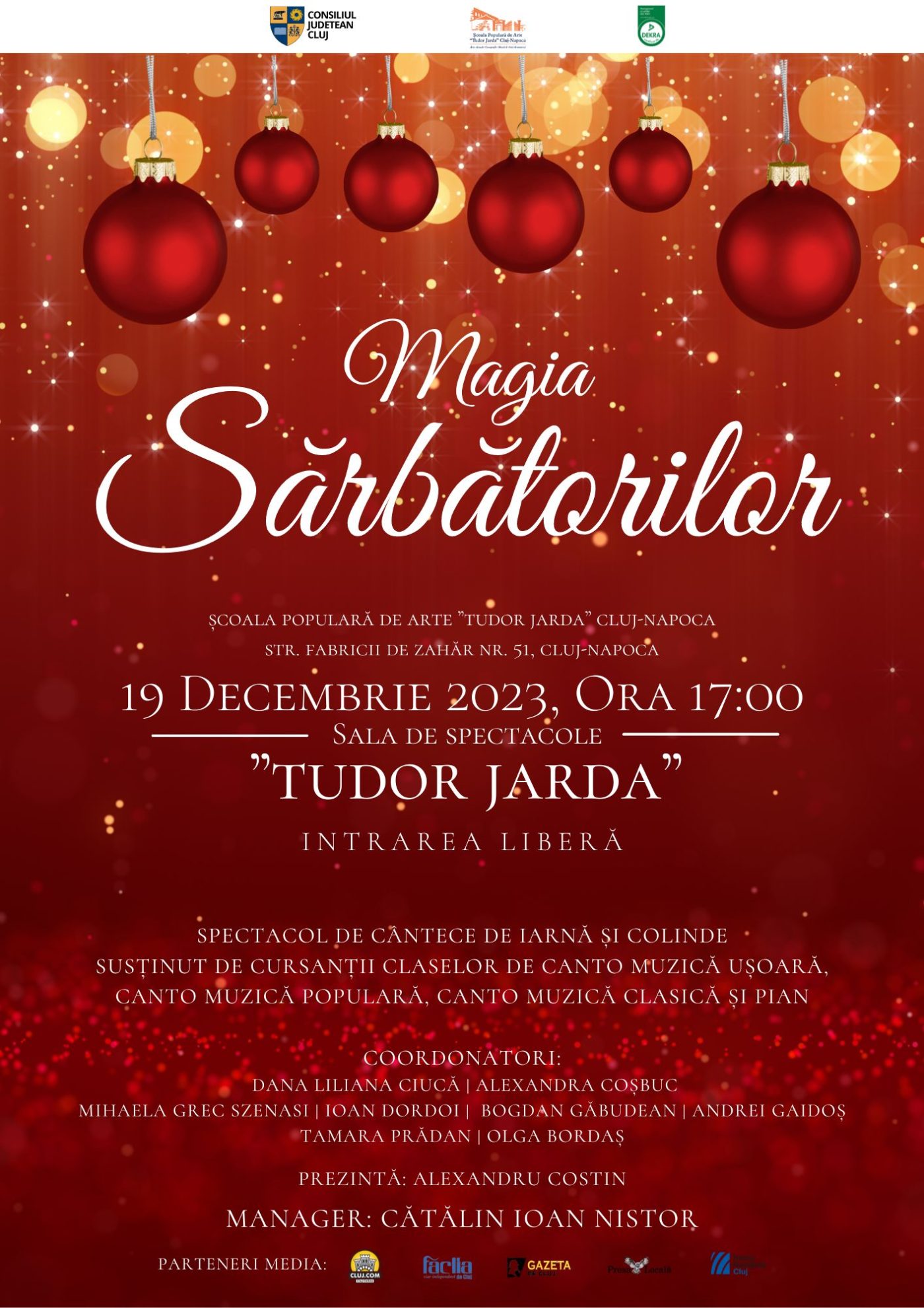 Școala Populară de Arte „Tudor Jarda”, instituție de cultură din subordinea Consiliului Județean Cluj, organizează un spectacol de cântece de iarnă și colinde, intitulat „Magia sărbătorilor”. Știriul va avea loc marți, 19 decembrie a.c., începând cu ora 17:00, la sediul școlii situat pe str. Fabricii de Zahăr nr. 51 din Cluj-Napoca, în Sala de spectacole „Tudor Jarda”.