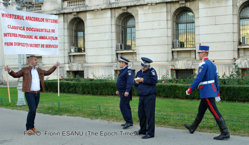 Evident că, imediat după ce a scos la vedere prima pancartă, a început ceea ce era de așteptat: au apărut polițiștii din sediul ministerului, apoi câțiva băieți cu ochelari de soare, câțiva jurnaliști, plus tot tacâmul cu legitimarea protestatarului – nota bene, au fost legitimați acolo inclusiv jurnaliștii care doar își făceau meseria! -, apoi întrebări peste întrebări, invitații discrete în clădire; de fapt, ex-polițistul chiar avea pregătit un memoriu pentru ministrul Gabriel Oprea. Și Lucaciu a ajuns până la urmă direct în biroul unui consilier al ministrului, memoriul său a fost înregistrat oficial, spunându-i-se că miercuri dimineață documentul va fi în mapa de lucru a ministrului Oprea. De subliniat că omul în cauză și-a scris mesajele publice pe două pancarte, după cum se poate observa în fotografii. Mesajele au fost acestea: ”Ministerul Afacerilor Interne = slugă pentru o procuroare” și ”Ministerul Afacerilor Interne clasifică documentele de interes personal al angajaților prin dispoziții secret de serviciu!”.
