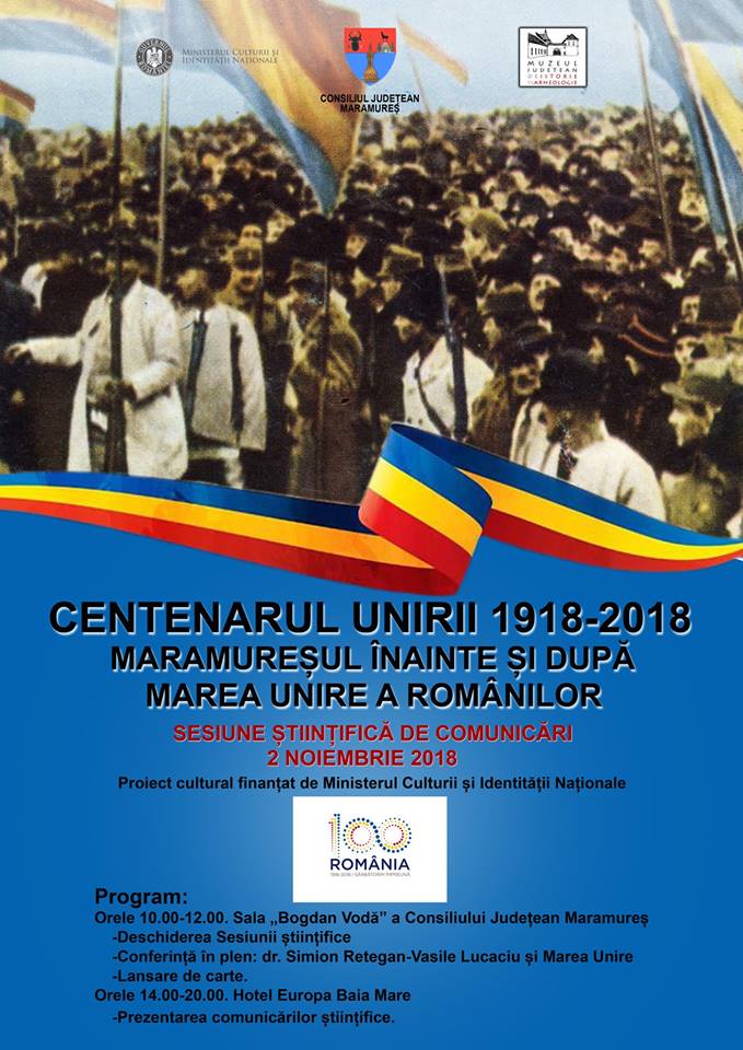 Muzeul Judeţean de Istorie şi Arheologie Maramureş în colaborare cu Ministerul Culturii şi Identităţii Culturale şi Consiliul Judeţean Maramureş organizează, în data de 2 noiembrie 2018, sesiunea ştiinţifică de comunicări „Centenarul Unirii 1918-2018. Maramureşul înainte şi după Marea Unire a Românilor”.