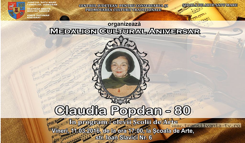 Vineri 11 martie 2016, de la ora 17:00 în organizarea Centrului Judeţean pentru Conservarea şi Promovarea Culturii Tradiţionale, în parteneriat cu Școala de Arte și cu sprijinul Consiliului Județean Satu Mare, va avea loc Medalionul Cultural Aniversar „Claudia Popdan- 80”, la sediul şcolii de Arte. Basarabeancă de origine, Claudia Popdan, născută Lisnic, a văzut lumina zilei în data de 11.03.1936, în localitatea Cobâlea (azi Republica Moldova). A fost o elevă eminentă şi părinţii se hotăresc să- i urmeze studiile la Liceul Pedagogic din Satu Mare. Talentul deosebit şi vocea clară şi frumoasă determină dascălii să o sfătuiască să urmeze Conservatorul de Muzică din Cluj. Între timp se cunoaşte cu artistul plastic Ion Popdan cu care se căsătoreşte în anul 1965. După absolvirea Conservatorului este repartizată la Teatrul din Baia Mare ca solistă vocală. Din anul 1966 a predat la Şcoala Populară de Arte din Municipiul Satu Mare, iar între anii 1974-1978 a fost numită directoare la Liceul de Muzică, îndeplinind şi funcţia de Secretar de Muzică la Filarmonica de Stat. A fost prezentă în viaţa culturală a municipiului fie ca solistă de muzică la diferite spectacole şi recitări, fie ca dirijor. Claudia Popdan fiind timp de 27 de ani dirijorul corului mixt „Gaudeamus”. A colaborat cu pianişti deosebiţi din România ca şi Weis Ferdinand şi Rónai István, a prezentat Lieduri de Ludvig van Bethowen, şi Claude Debusy.