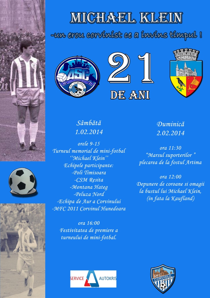 Sâmbătă 1 februarie va avea loc memorialul „Michael Klein” la mini-fotbal, iar duminică 2 februarie un marș al suporterilor hunedoreni și o depunere de coroane la monumentul fostului fotbalist al Corvinului.