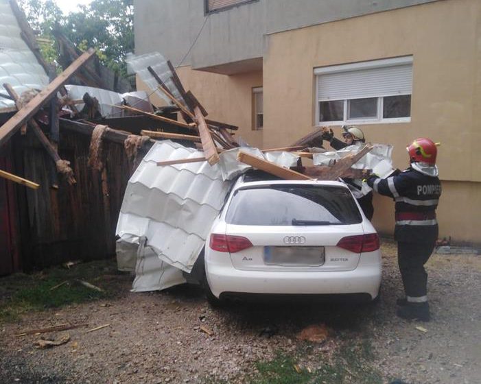 Între orele 17.50 -20.20, echipajele de pompieri militari ale Detașamentului Salonta au acționat în municipiu, pe strada Republicii, pentru degajarea acoperișului unui bloc de locuințe, smuls de vânt şi prăbuşit peste două garaje și două autoturisme, respectiv pe strada Iuliu Maniu, pentru înlăturarea unor elemente instabile din structura acoperișului Casei de Cultură, care prezentau pericol pentru trecători.